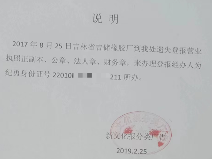 5、吉储橡胶厂营业执照在 2005 年已经被吊销。吉林省市场监管厅在 2017年8月28日再次颁发并由宽城区发改局授权的指定代理人谢景霞(宽城区发改局公务人员)领取新的吉林省吉储橡胶厂营业执照,严重违反了《中华人民共和国企业登记管理条例》的规定。
