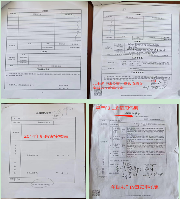 ——伪造材料,篡改集体企业性质。宽城区发改局跨区越权接管绿园区企业,伪造职工签名、副局长纪勇非法挂失企业公章后再行私刻公章,虚构法定代表人刘影,非法代替市场主体提出申请。吉林省市场监管厅审批办违法将集体所有制企业登记为 “政府机关100% 出资”,为掠夺资产铺路。