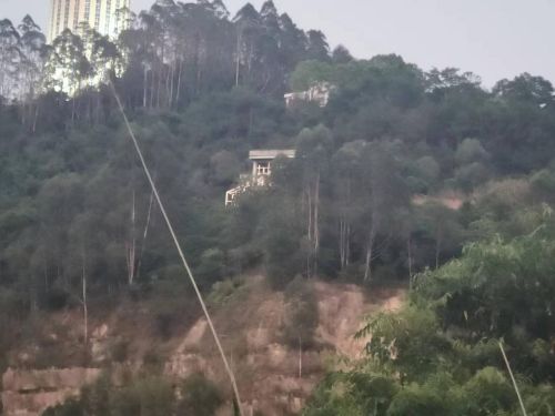 在距离主路数十米远的山坡上,有一栋未完工的建筑。穿过草木,记者看到一栋水泥、钢结构的两层楼房,依坡而建,前无遮挡,占地面积约两三百平方米,硬化地基大概一米多高。同一山坡上,还有一处建筑残垣,仅剩一根梁柱立在陡坡边。