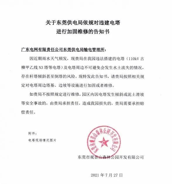 2021年7月27日,东莞观音山方面发函敦促东莞市供电局,尽快依法依规对观音山公园内因违法架建而导致山体塌方形成的倾斜电塔的塔基进行维护加固。
