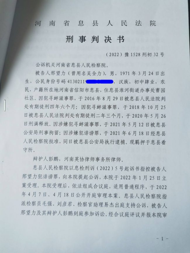 2022年4月25日,邢望力的家属首次见到该判决书:河南省信阳市息县法院认定《致社会各界人士及网友的一封求助信》系虚假信息,诽谤多名公职人员,造成社会恶劣影响,将邢望力以“诽谤罪”判处有期徒刑2年11个月。