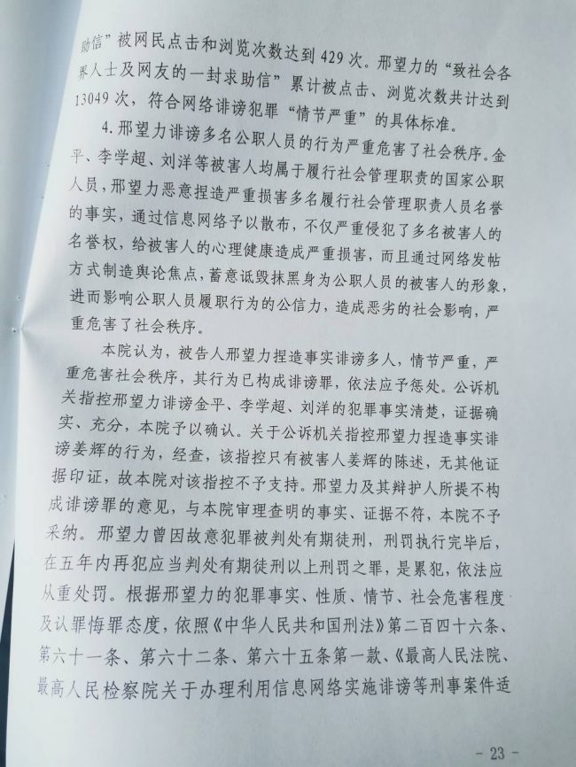 判词又说, 邢望力不仅指使邢鉴把包含捏造事实的求助信在互联网上散布,自己也把该帖转发到微信群组和微信好友,在网络上散布。在网站上浏览次数超过1万2千多次,符合网络诽谤犯罪“情节严重”的具体标准。